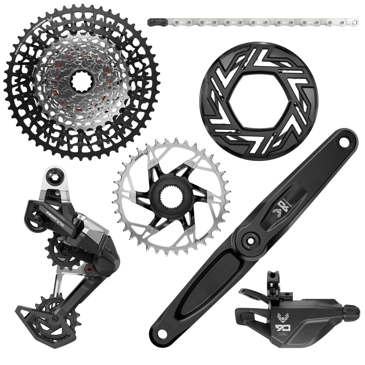 • Eagle 90 rear derailleur, shifter, Eagle 90 ISIS crankarms with 36 tooth w/clip on guard