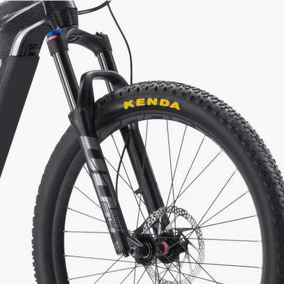 The hydraulic suspension, featuring 120mm of travel and a lockout function, expertly absorbs impacts and dampens vibrations on uneven terrain, elevating comfort, traction, and control for a smoother, more secure ride.
